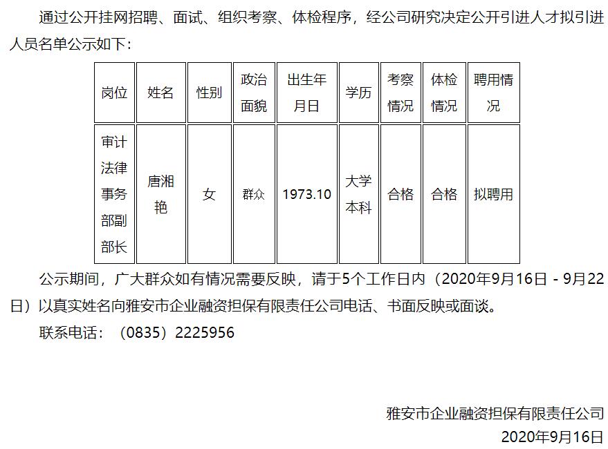 雅安市企業(yè)融資擔(dān)保有限責(zé)任公司公開引進人才擬引進人員名單公示
