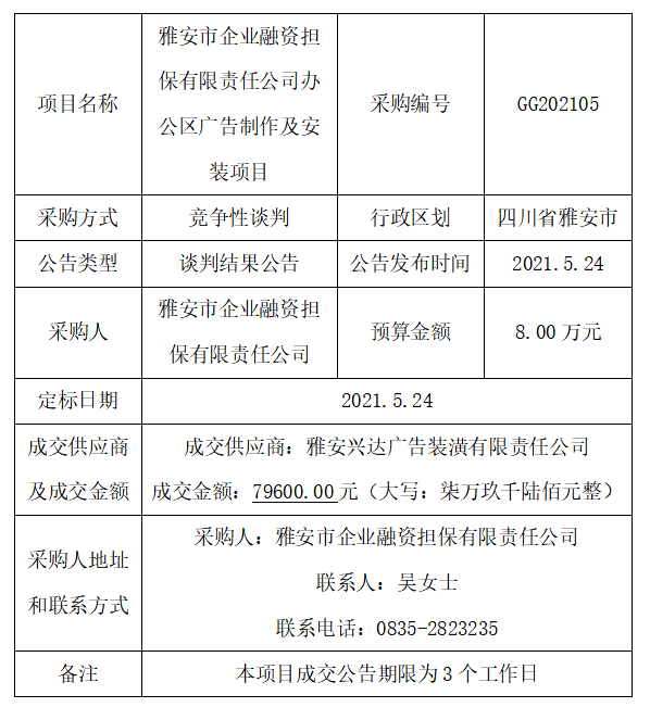 雅安市企業(yè)融資擔(dān)保有限責(zé)任公司辦公區(qū)廣告制作及安裝項(xiàng)目競爭性談判結(jié)果公告